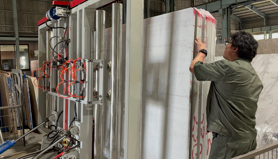 専用ソフトでスキャンしたスラブデータを基に石どりを行います。