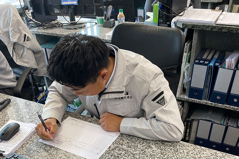 お客様から注文をいただき、その内容を元に(図面データや伝票)工場へ製作依頼し、お客様または現場へお届けする業務です。